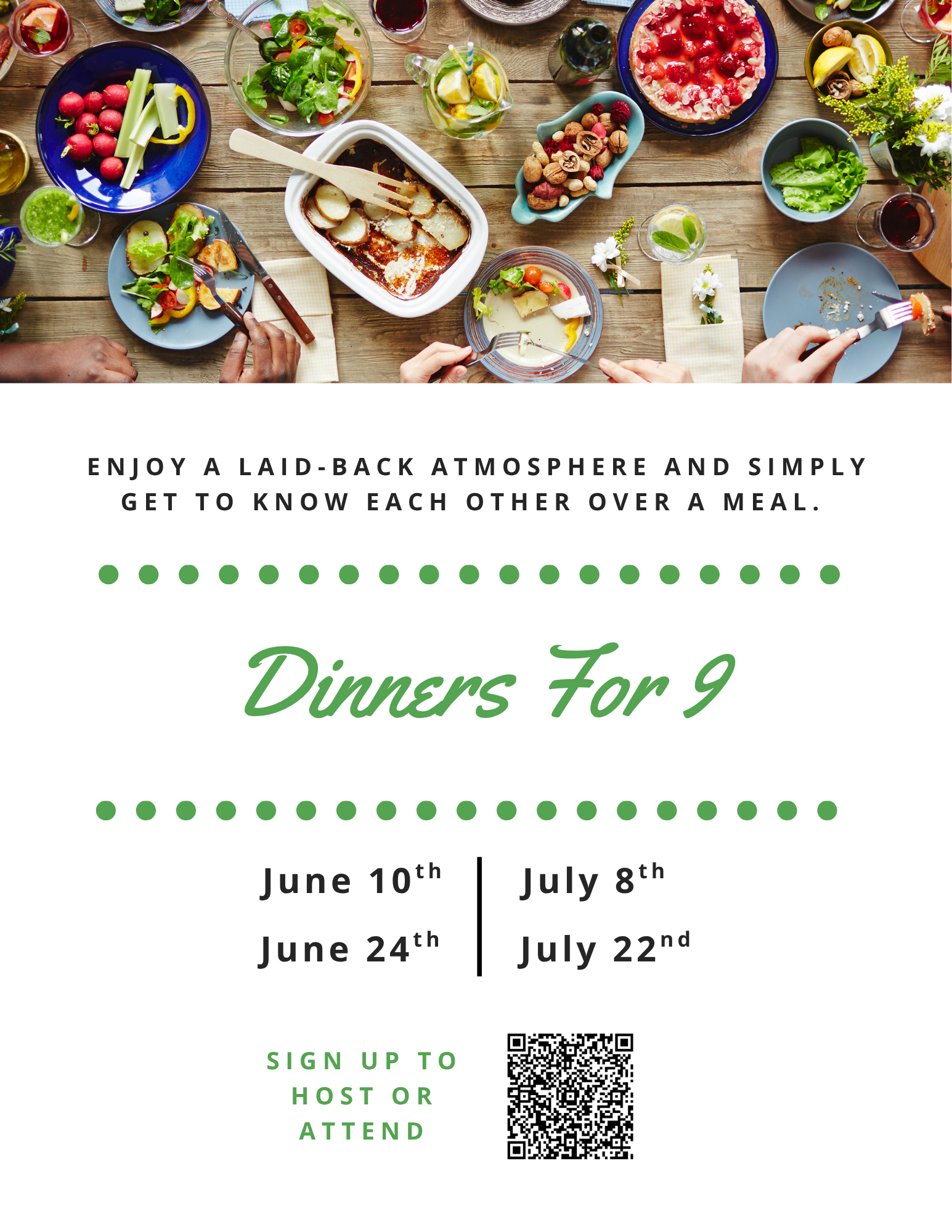 Every Summer we host a series of Fellowship Dinners called Dinners for 9! This is a great opportunity for our church community to enjoy a laid-back atmosphere and simply get to know each other over a meal. These dinners are made up of 9 individuals (some may have a few more counting kiddos) and will be hosted at homes in and around Athens. Each dinner will be its own event that you can sign up for with a new group of folks every time. Dinners will be every other Wednesday, in June & July. Each host will let you know what time and what you can bring to share with the group.